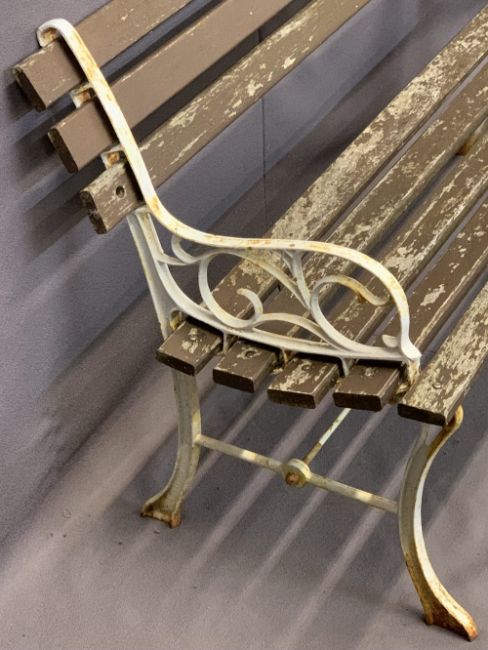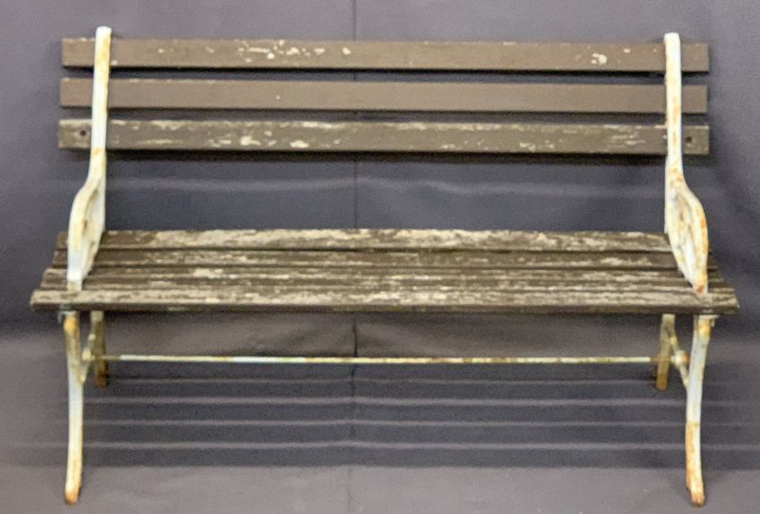 WOODEN SLATTED GARDEN BENCH with cast iron ends, 70cms H, 122cms W, 41cms seat D