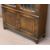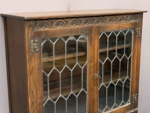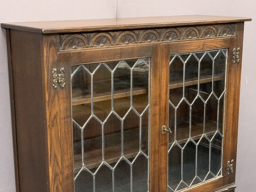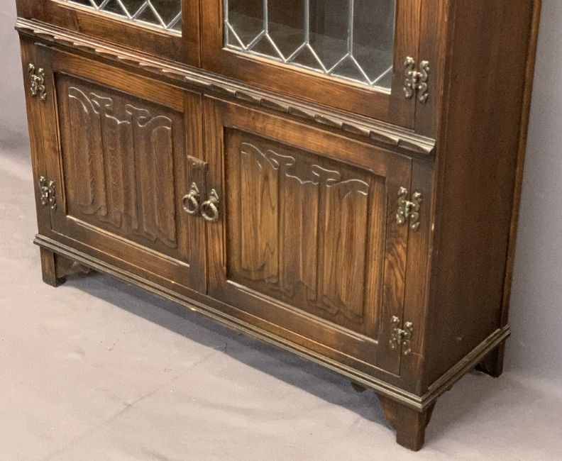 JAYCEE OAK BOOKCASE CUPBOARD having carved and linenfold detail with twin leaded glazed upper doors and interior shelving above a two door cupboard base, 134.5cms H, 98cms W, 33.5cms D