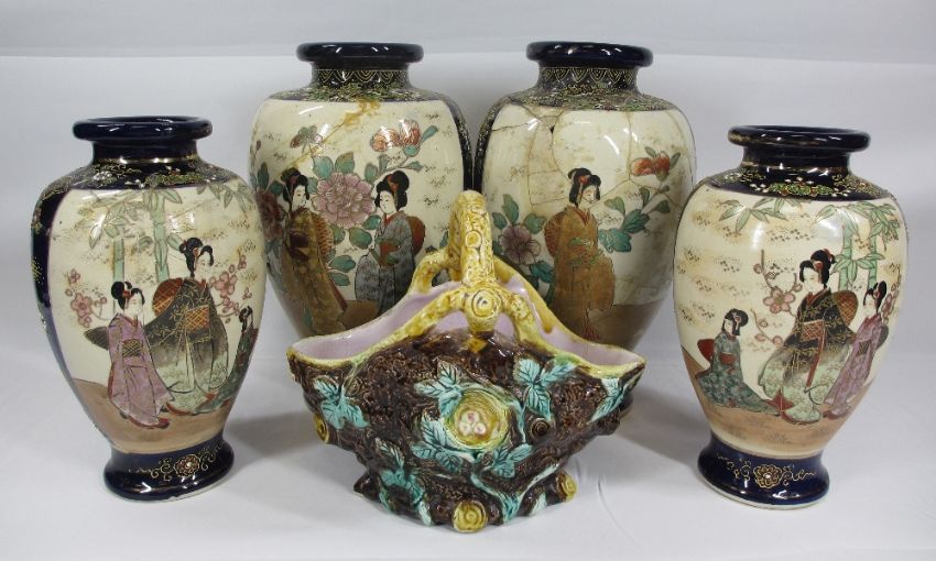 SATSUMA VASES, TWO PAIRS - 33cms and 28cms respectively and a Majolica basket
