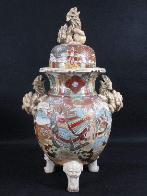 SATSUMA VASES - a trio of lidded and twin-handled, 48cms the tallest. Also, a soapstone receptacle and a Studio pottery vase, 26.5cms tall