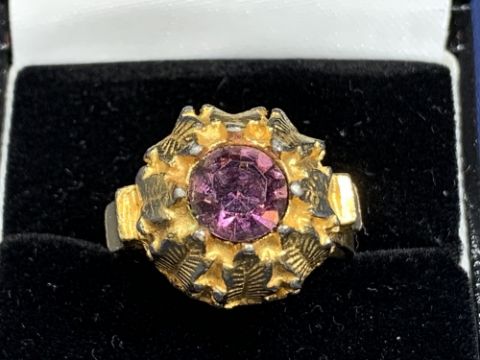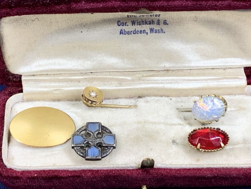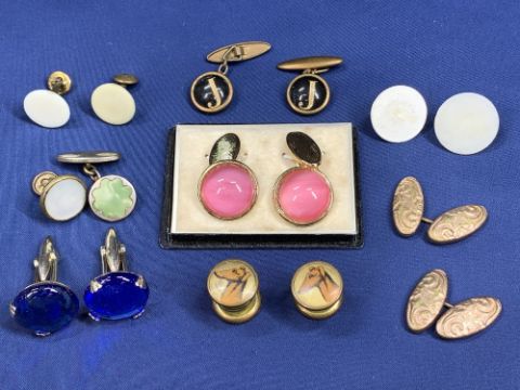 GENT'S JEWELLERY - a mixed quantity including 9ct rolled gold and other cufflinks, one early double pair showing images of dog's heads, tie clips, 5 stick pins, one marked 9ct with seed pearl centre, an opal set example, white metal Celtic cross style set with agate, leaf design gilt metal ring with amethyst colour stone centre, size P and a yellow metal chunky bracelet with padlock clasp with curb links (unmarked, believed not gold)