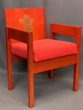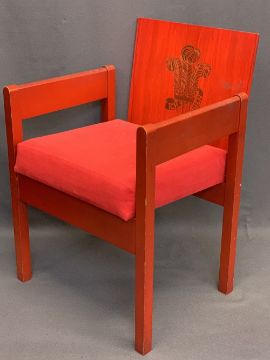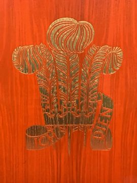 PRINCE OF WALES INVESTITURE CHAIR 1969 - designed by Lord Snowdon and manufactured by Welsh Remploy factories in stained beech and plywood with olive ash, embossed with Prince of Wales feathers motif in gold leaf, 79cms H, 55cms W, 47cms seat D (seat pad replaced)