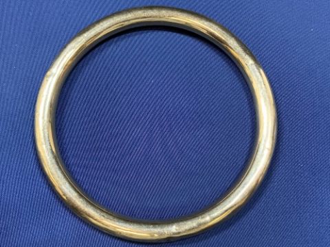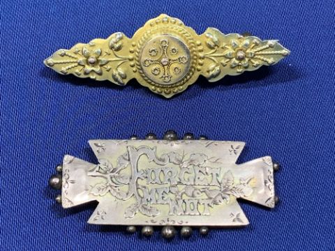9CT GOLD JEWELLERY (4 ITEMS) to include an 8.5cms diameter bangle, two Victorian bar brooches, one with 'Forget me Not' detail (pin lacking) along with a modern 9ct gold fine link necklace, 60cms total L, 12.6grms the bangle, 18.5grms gross