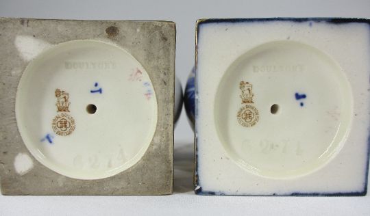 ROYAL DOULTON VASES - on square bases in Cobalt Blue with gilt detail, 21cms tall