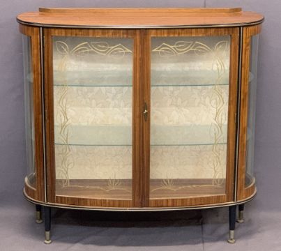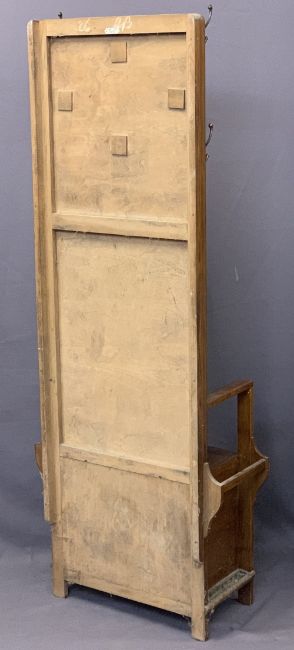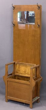 VINTAGE FURNITURE PARCEL, 3 ITEMS to include an oak mirrored box seat hall stand, 179cms max H, 67cms max W, 32cms D, two door shaped china display cabinet with convex end glass panels, 99cms H, 103cms W, 35.5cms D and a Lloyd Loom style blanket box with upholstered top, 47cms H, 107cms W, 41cms D