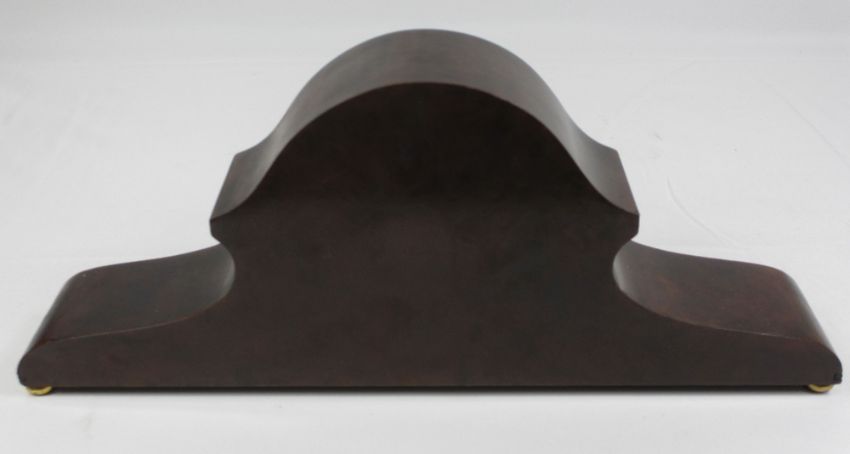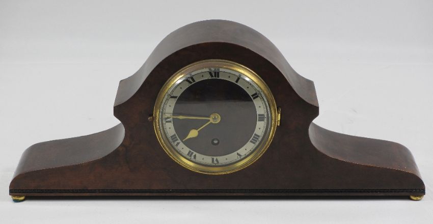 ANTIQUE WALNUT MANTEL CLOCK with Roman numeral dial and brass bezel, 17cms H, 42cms W, 8cms D