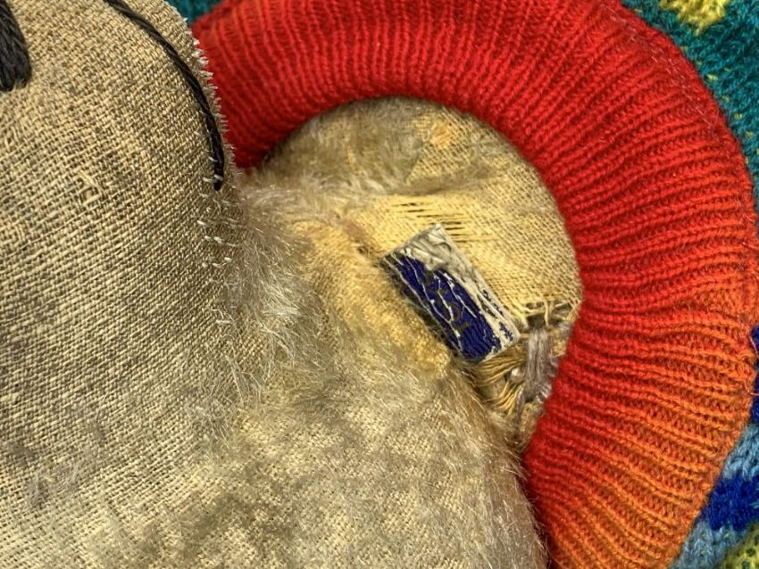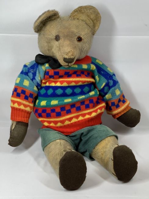 VINTAGE STRAW FILLED TEDDY BEAR - 60cms L with growler, humpback and jointed limbs, playworn condition to include the loss of one eye, replacement pads, worn areas to the fabric and most of the fur lost, now dressed in corduroy pants, woolly jumper and black bow tie, growler working