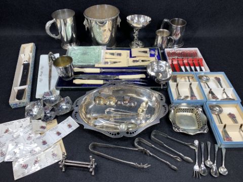 EPNS & STERLING SILVER ASSORTMENT including souvenir bookmarks and pendants, flatware sets. Also, ice bucket, food warmer and mixed cutlery