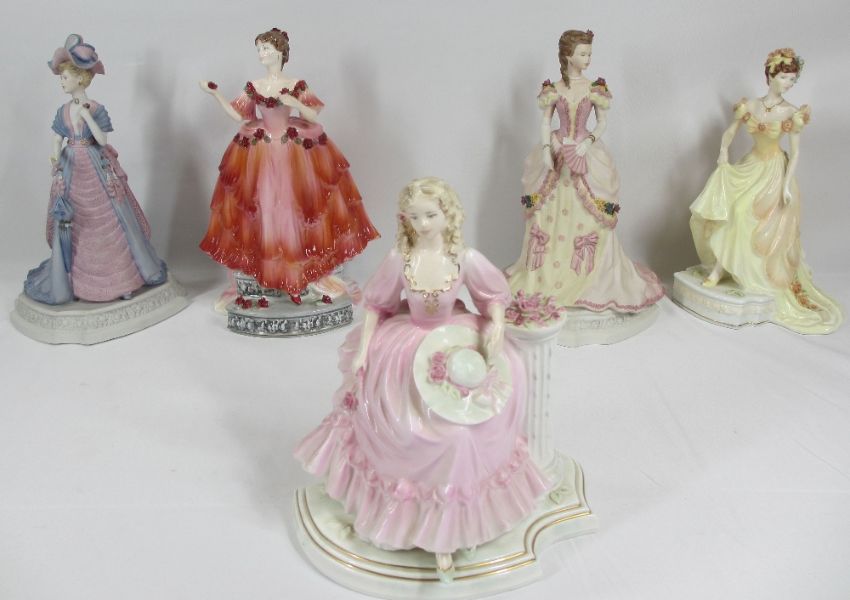 COALPORT FIGURINES (5) - Evening Ball, Royal Enclosure at Ascot, Sweet Juliet, Marlina and May Queen, 26cms H the tallest