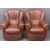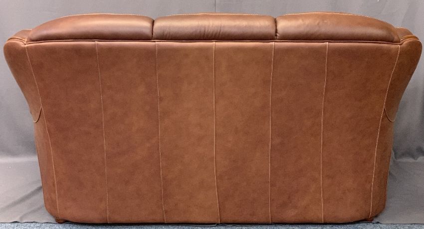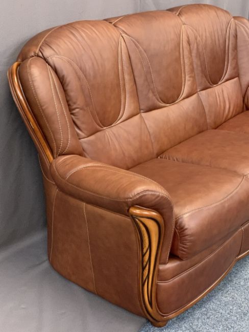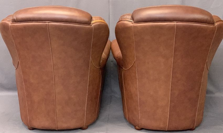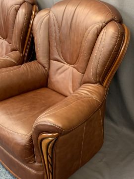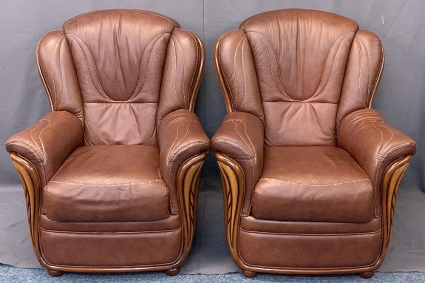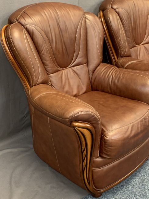 STYLISH ITALIAN MADE BROWN LEATHER EFFECT THREE PIECE LOUNGE SUITE consisting of three seater couch, 101cms H, 195cms W, 50cms seat D and a pair of matching armchairs, 101cms H, 87cms W, 50cms seat D