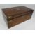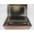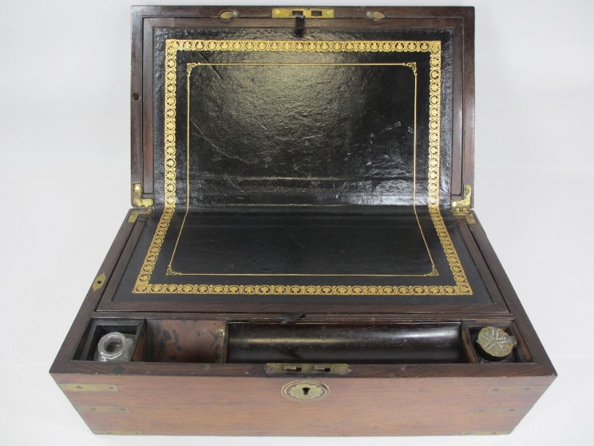 ANTIQUE WRITING SLOPE - brass bound and floral brass central insert having a leather tooled interior, 17cms H, 43cms W, 24.5cms D