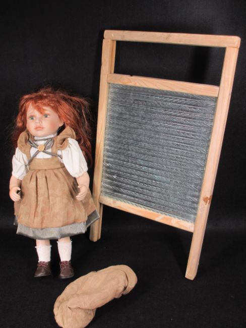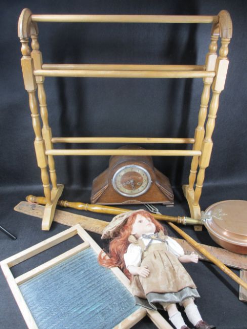 ASSORTED VINTAGE ITEMS to include a washboard, porcelain headed doll, mantel clock, bed warming pan, towel rail, ETC
