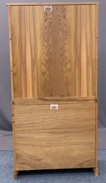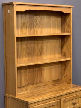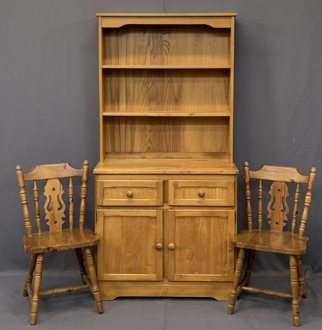 NEATLY PROPORTIONED MODERN PINE EFFECT DRESSER and two spindle farmhouse chairs, 173cms H, 91cms W, 43cms D and 84cms H, 44cms W, 36cms seat D, measurements respectively