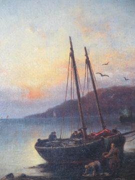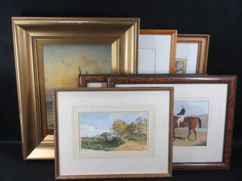INDISTINCTIVELY SIGNED oil on panel - fisherman at work under a sun setting sky, 24 x 35cms. Also, hunting prints and an assortment of other paintings and prints