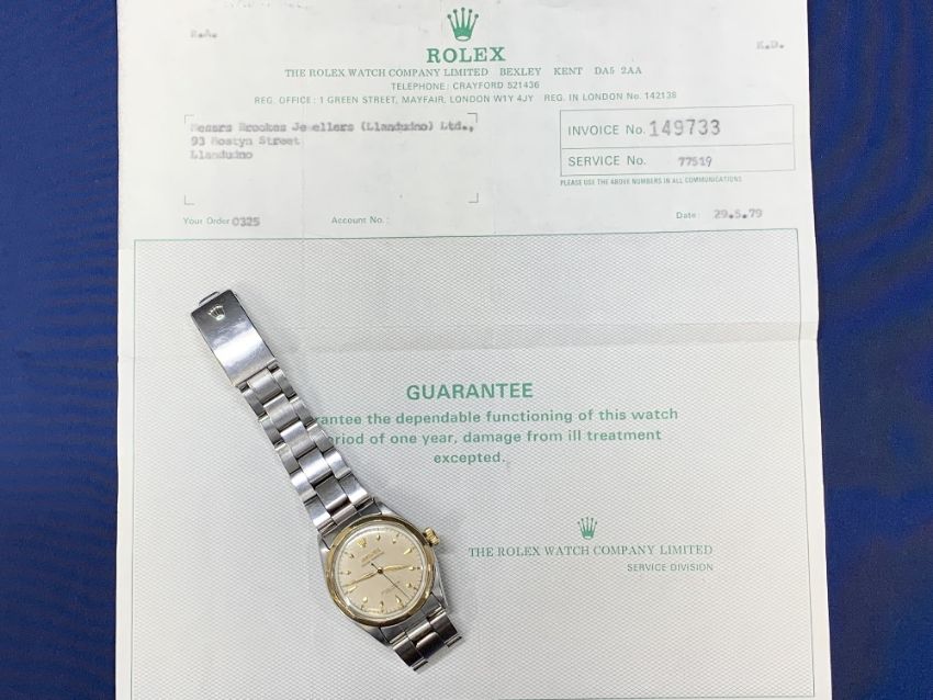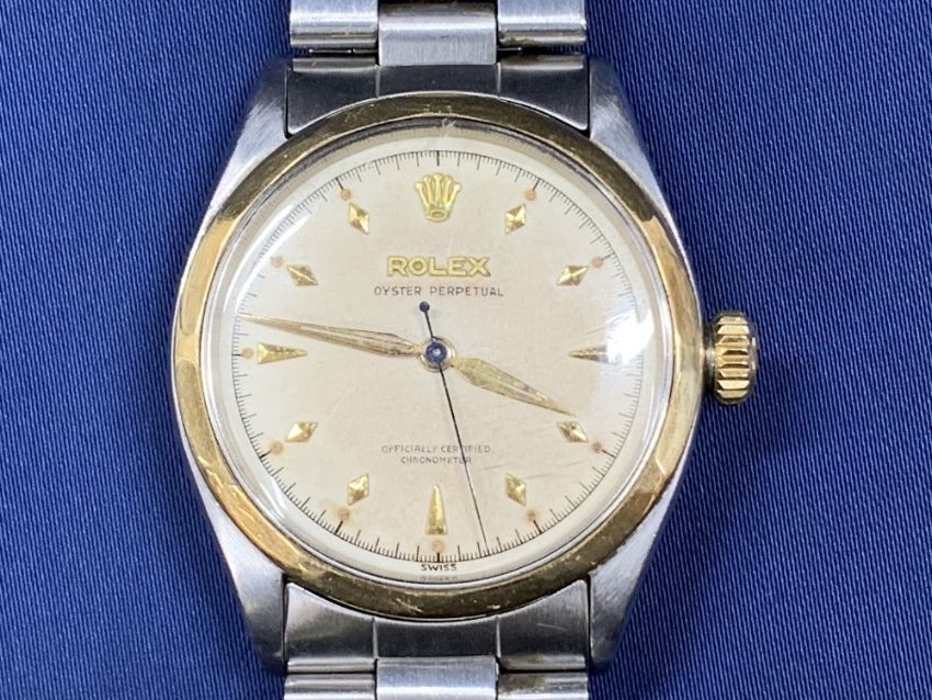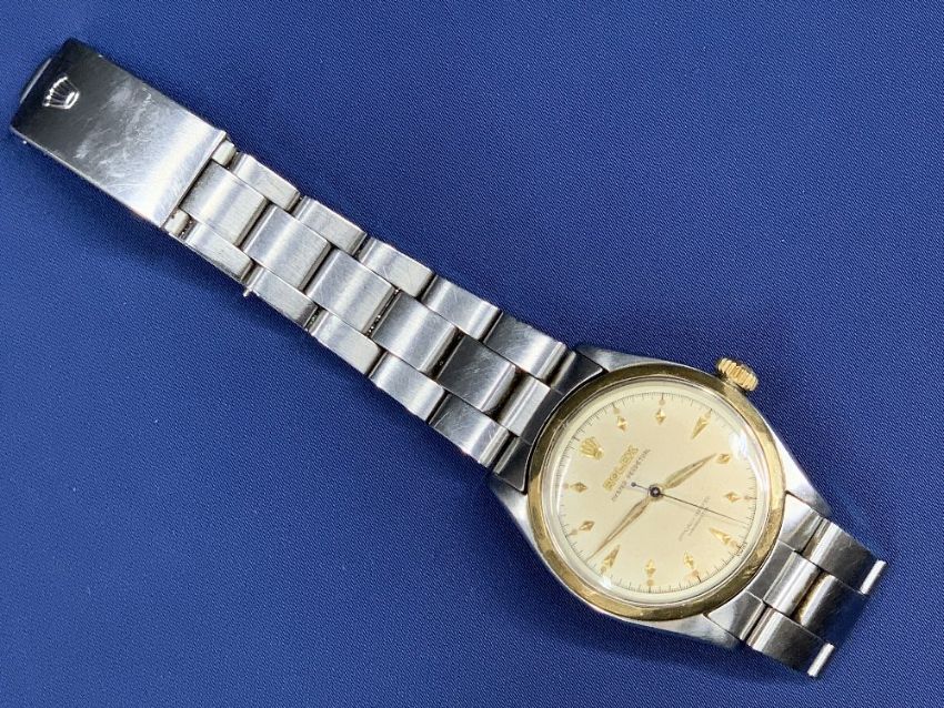 ROLEX OYSTER PERPETUAL STAINLESS STEEL GENT'S BRACELET WRISTWATCH - No 976511 circa 1960, gold bezel and crown winder, champagne dial with arrowhead markers, screw on bubble back marked 'Registered Design Modele Depose', strap ends No 557, first link 78350/19, 33mm case excluding winder, not currently working, no box or paperwork except a 1979 dated service number receipt