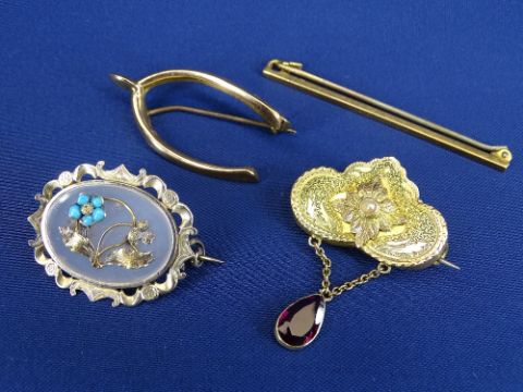 9CT GOLD WISHBONE, 1grm, an 18ct gold narrow pin, 2grms, a small shaped floral brooch, 2.4grms and an agate and silver brooch, 5.4grms, five items totalling approximately 11grms