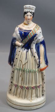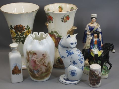 DICK TURPIN STAFFORDSHIRE FLATBACK, 25cms H, also, Queen Victoria 29cms. Victorian Milk glass vase, blue and white cat figure, large vases, ETC, 35cms the tallest