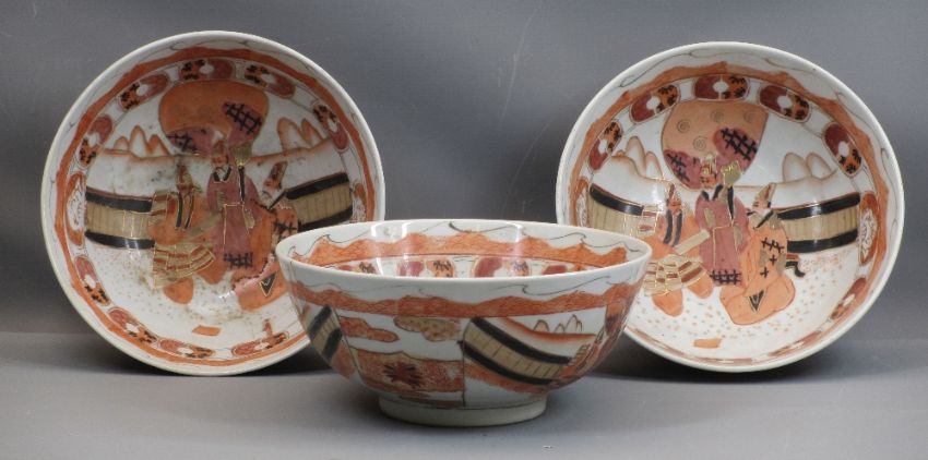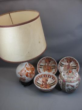 CHINESE & JAPANESE 20TH CENTURY CERAMICS to include Canton jar and cover, 23cms H, three bowls, 26cms diameter and a Kutani style table lamp, 68cms H including the shade