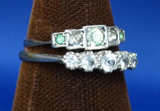 9CT GOLD JEWELLERY, 5 ITEMS - to include a Mizpah ring, size V, two paste set dress rings size Mid N-O and Q along with two fine link necklace chains, 25 and 20cm lengths, 10.4grms gross, 3.7grms the individual weight of the Mizpah ring