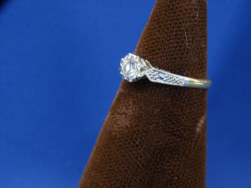 18CT GOLD DIAMOND SOLITAIRE DRESS RING - the single diamond of 0.35ct, visual estimate, with platinum shoulders, size K, 2.5grms