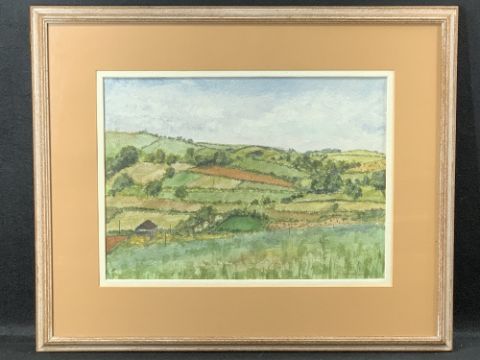 AUDREY LONDON watercolour - rural hillside with farm buildings, signed, 26 x 36cms
