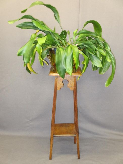ASPIDISTRA PLANT IN A BRASS COAL SCUTTLE on a two tier oak stand, 160cms overall H