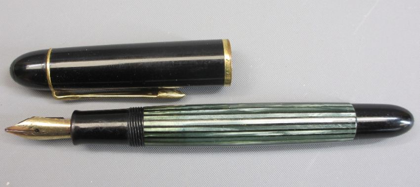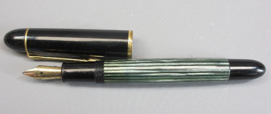 PELIKAN 140 FOUNTAIN PEN, VINTAGE (1950s - mid 60s) - black and green stripe with piston filler, gold plated trim and original 14ct gold nib marked "Pelikan 14c - 585"