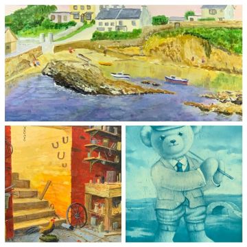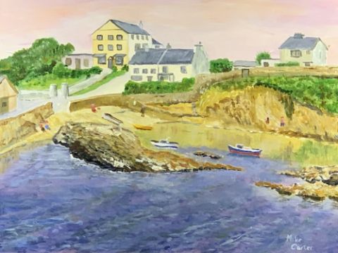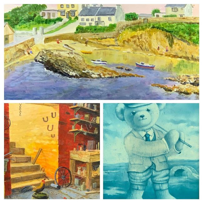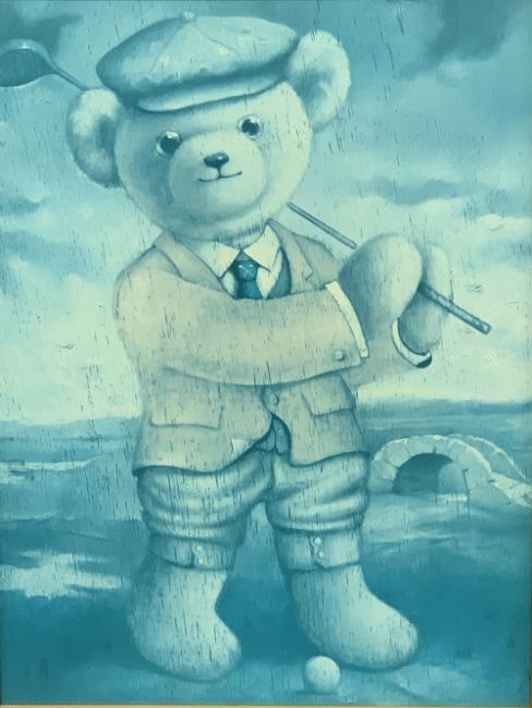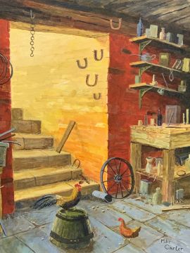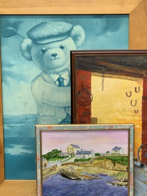 MIKE CARTER oil on board - Bull Bay coastal scene with figures and boats, signed, 24 x 30cms and MIKE CARTER acrylic on board - interior scene with workbench, chickens, ETC, signed, 50 x 40cms and a large modern pine framed print of a standing golfer bear