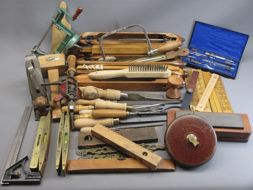VINTAGE TOOLS - milliner's shuttles, brass mounted spirit levels, ETC, to include a quantity of boxwood folding rules including Rabone Chesterman, Draper and others