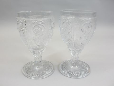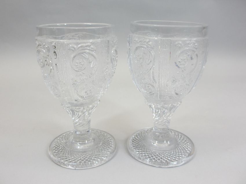 GLASSWARE - three Cranberry glass pieces, a green glass goblet, a pair of good quality pressed glass goblets and lidded sugar basin, all with swirled decoration and a pair of pressed glass tapered vases, each etched with an inscription 'Bardsey Island 1858' (chip and crack to one vase)