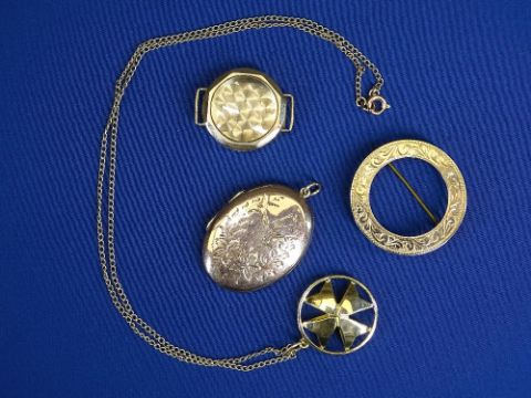 9CT GOLD OVAL BACK & FRONT LOCKET, 5grms, a 9ct gold lady's wristwatch case with glass, 2.6grms, a George Cross pendant with yellow metal chain, 3grms, a 9ct circular brooch frame, 2.5grms and a 9ct turquoise ring size N, 2.4grms. Five items, total approximately 15grms
