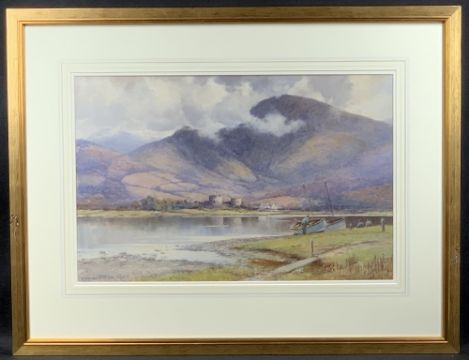 WARREN WILLIAMS ARCA watercolour - castle by lake with fishermen, signed, 37.5 x 57.5cms