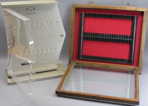 PARKER PENS REVOLVING DISPLAY STAND and a vintage oak glass front wall cabinet fitted to display fountain pens, 44.5cms H, 36cms W, 20cms D and 46cms H, 40cms W, 3.5cms D measurements respectively