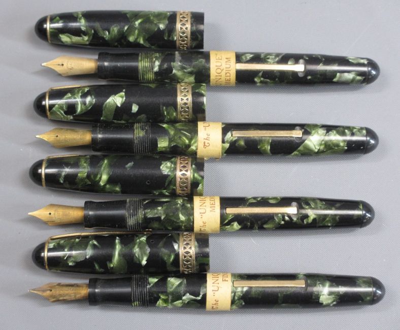 THE "UNIQUE" PEN DE LUXE FOUNTAIN PENS (14), VINTAGE (1930s - 40s) - with gold plated trim and 14ct gold nibs (Fine and Medium) - red and black marble (5); green and black marble (4); brown and black marble (2); grey and black marble (2); and blue and black marble (1). All mint with original paper band to barrel.