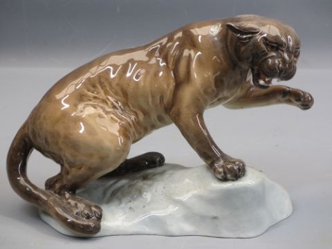 JACKFIELD TYPE BLACK POTTERY CATS (3) - 18cms H, poodle ornament and Beswick 1823 Puma on a rock