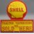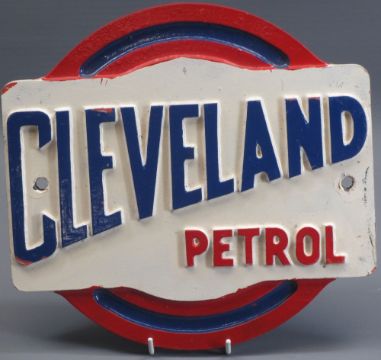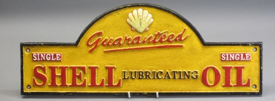 PETROL/OIL VINTAGE & LATER ADVERTISING MATERIAL - a red petrol can with brass Shell cap, reproduction cast and wooden advertising signs for Cleveland Petrol, Shell Lubricating Oil, Shell Tractor Vaporising Oil along with a brass No 2 Saturnus blow lamp