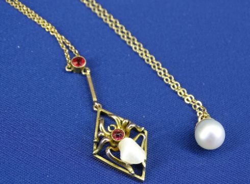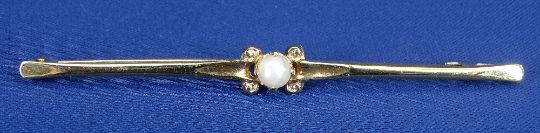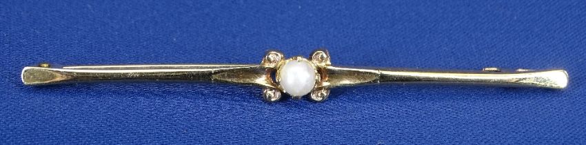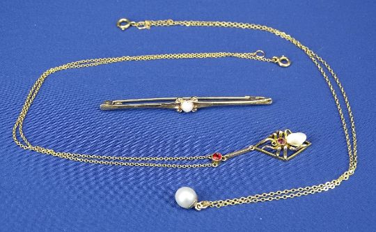 9CT GOLD PEARL BAR BROOCH, 2.5grms, a 9ct gold spider pendant and chain, 2.3grms and a 9ct pearl and pendant chain, 1.5grms, total approximately 6grms