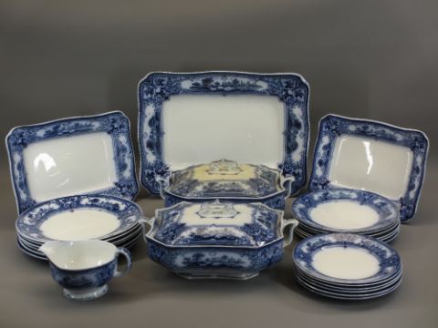 VICTORIAN FLOW BLUE PART DINNER SERVICE to include graduated platters (3), tureens and covers (2), various plates, ETC