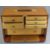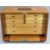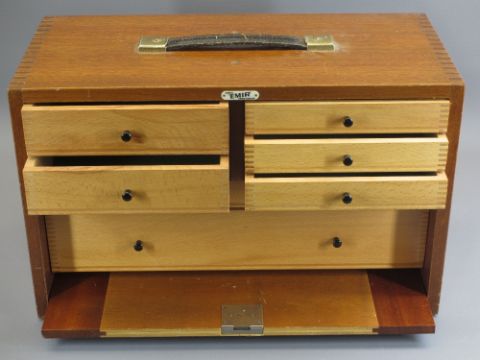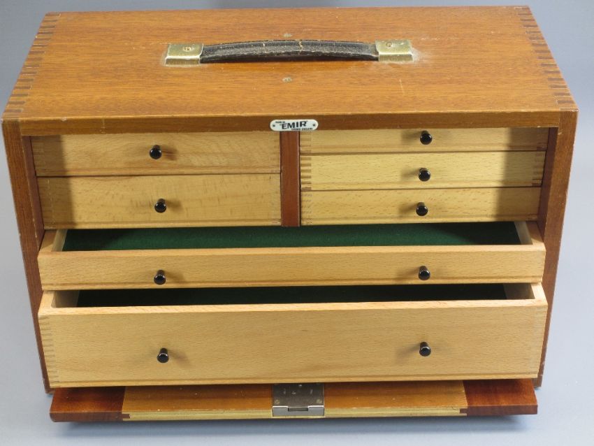 EMIR ENGINEER'S TOOL CHEST - in mahogany with top carry handle, drop-down front panel (key lacking) and an interior arrangement of seven various size drawers with black knobs, 29cms H, 45.5cms W, 22cms D, makers label attached to the front