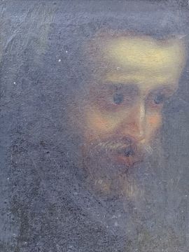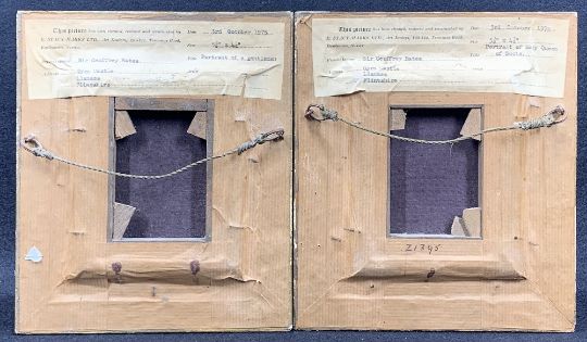 AFTER PAINTINGS IN THE LOUVRE PARIS two oil on canvas portraits - 1. Mary Queen of Scots, 13 x 10cms and 2. a portrait of a bearded gentleman, similar size, each bearing title and ownership labels dated October 1975 by the Restorers E Stacy-Marks Ltd