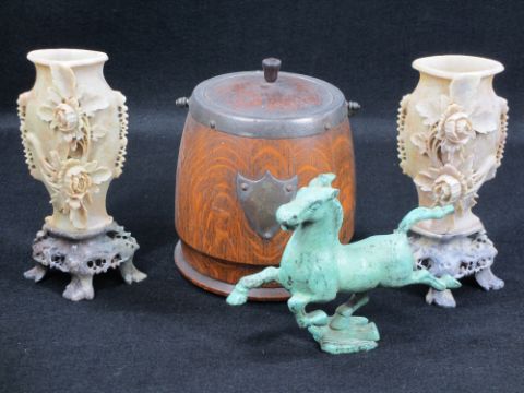 SOAPSTONE CARVED VASES - 20cms H, oak ice bucket and a cast prancing horse antiquity style ornament