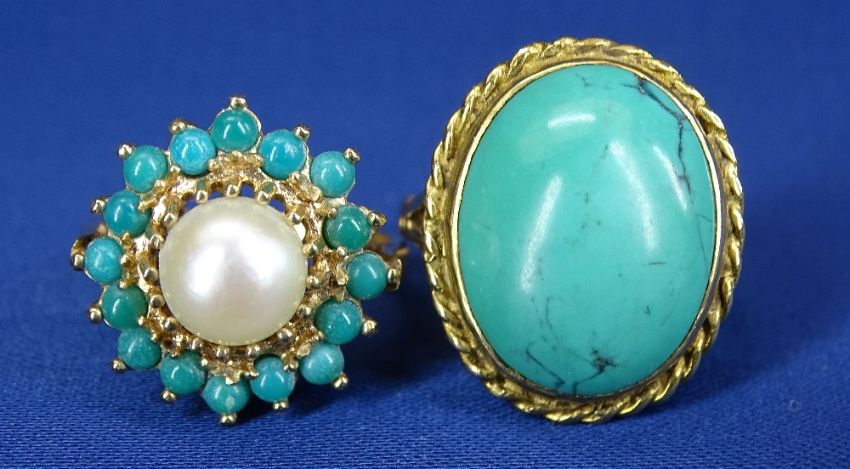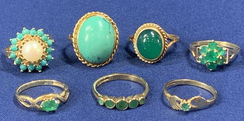 9CT GOLD DRESS RINGS (7) - various green stones, 21grms