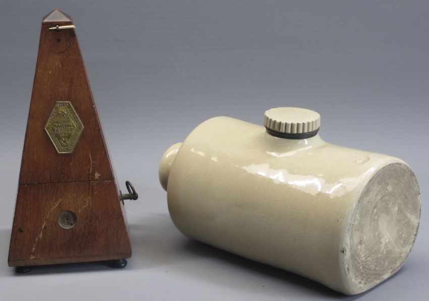 MINIATURE WOODEN DRESSERS (2), longcase clock, vintage mahogany metronome, Oriental and English vases (2) along with two stoneware hot water bottles, the dressers to include miniature metalware and other contents