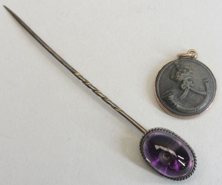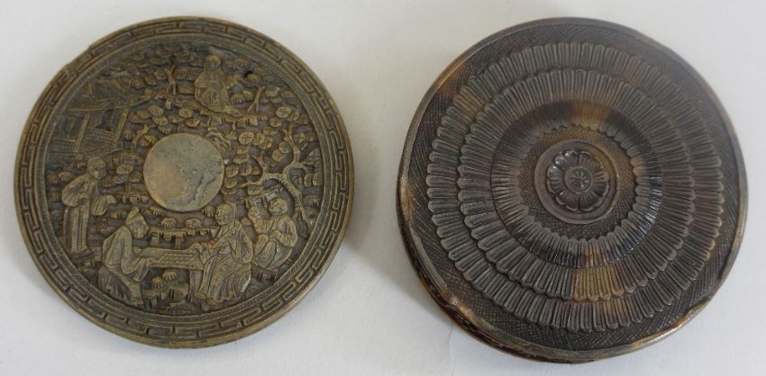 A CIRCULAR ORIENTAL TORTOISE SHELL BOX - with figures to the lid and pagoda decoration to the rim together with a cabochon amethyst style mounted pin and a small, believed Rose Gold circular pendant with crown and trumpet insert, ETC