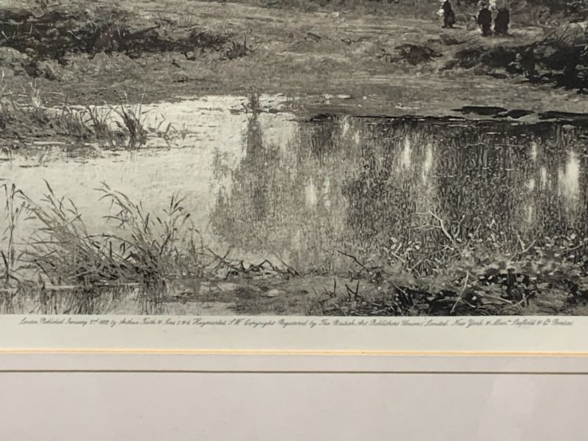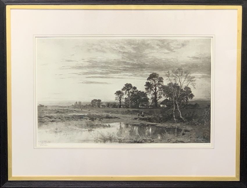 BENJAMIN WILLIAMS LEADER etching - fine pastoral scene with church, buildings and figures and sheep on a track, signed to the margin and with original printed signature and date 1892, 46 x 74cms