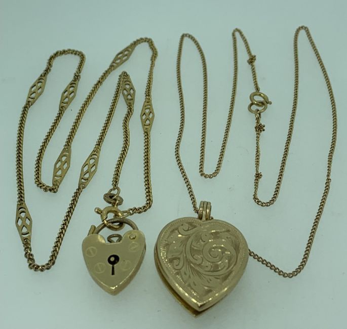 9CT GOLD PENDANT NECKLACES (2) - one having a heart shape opening locket with decorative engraving to the front, the other with a padlock, 7grms and 5.2grms respectively, 24.5 and 22cm overall lengths
