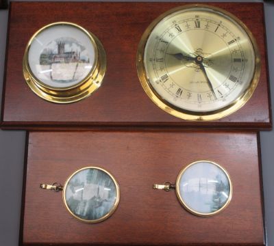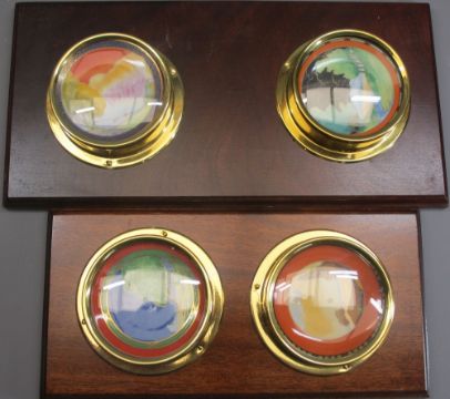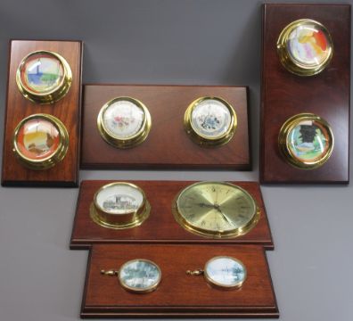 BRASS MOUNTED CHINA COLLECTABLES ON MAHOGANY WALL BOARDS (5)