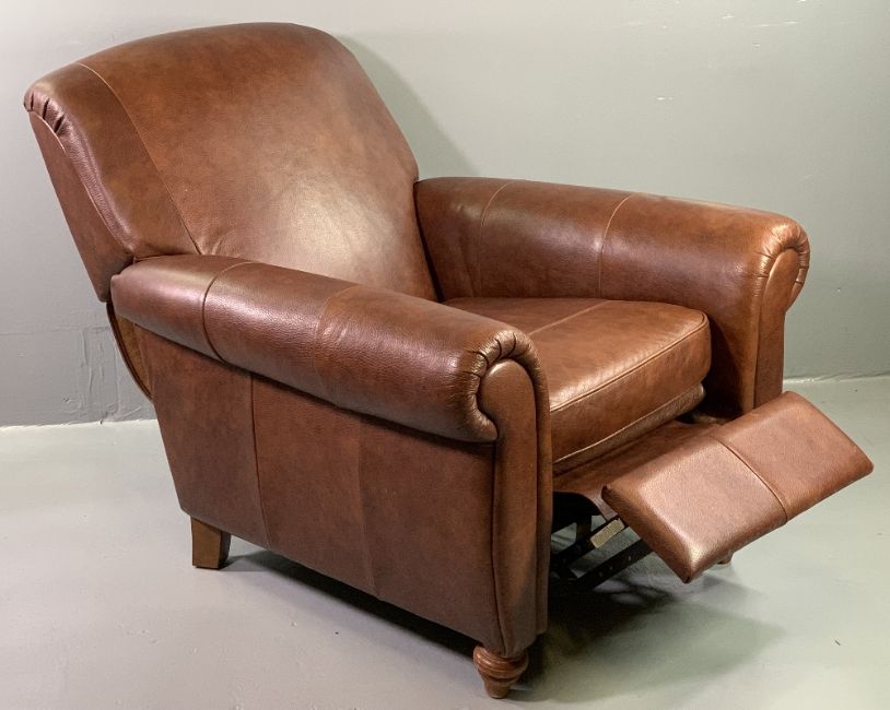 MARKS & SPENCER BROWN LEATHER RECLINING CLUB ARMCHAIR, 98cms H, 97cms W, 57cms D the seat