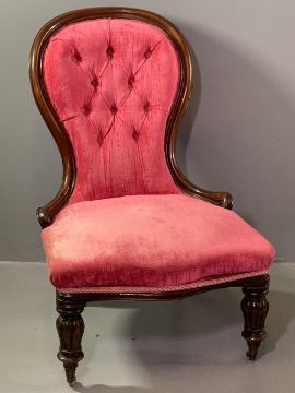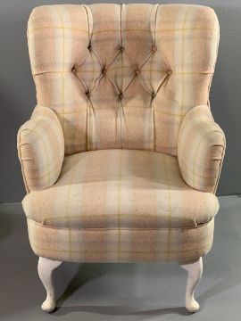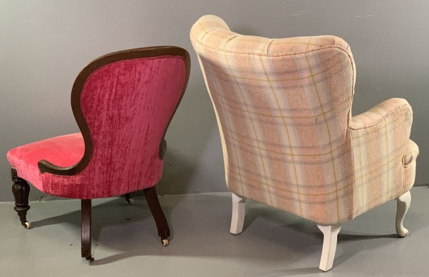 CIRCA 1900 MAHOGANY BUTTON UPHOLSTERED SPOON BACK SALON CHAIR, 88cms H, 60cms W, 46cms D the seat and a modern button upholstered tartan pattern armchair, 92cms H, 66cms W, 48cms D the seat