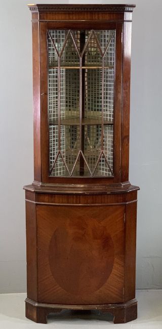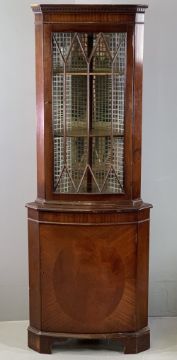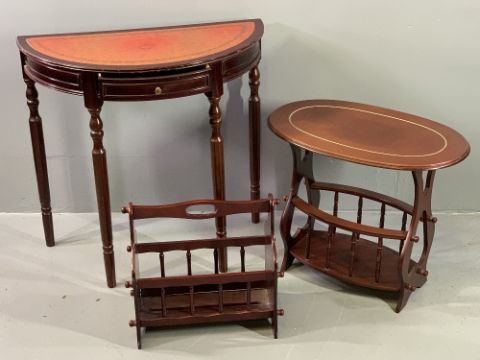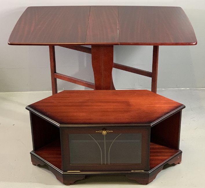 REPRODUCTION MAHOGANY FURNITURE PARCEL (6) - to include a glass topped corner display cabinet, 181cms H, 66cms W, a gate leg table, 85cms H, 80.5cms W, 21cms D (closed), single drawer half moon hall table, entertainment unit with drop down glass front door, magazine stand and one other with oval table top
